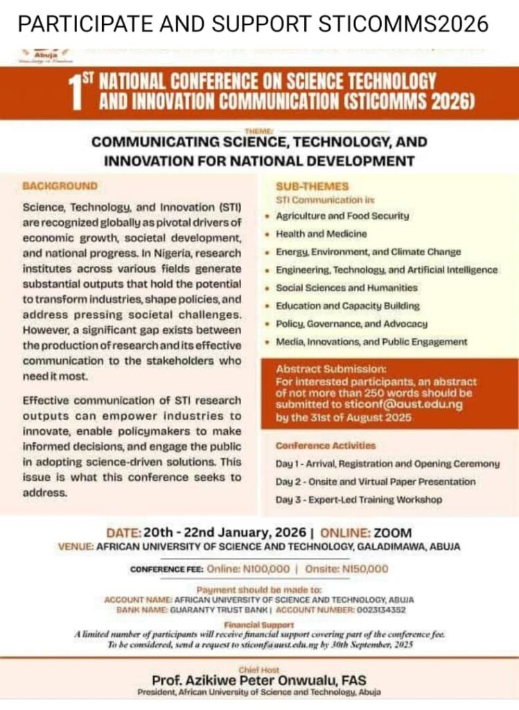 The maiden edition of Nigeria’s Science, Technology and Innovation Communication Conference (STICOMMS) is scheduled to hold from January 20 to 22, 2026, at the African University of Science and Technology (AUST), Abuja.